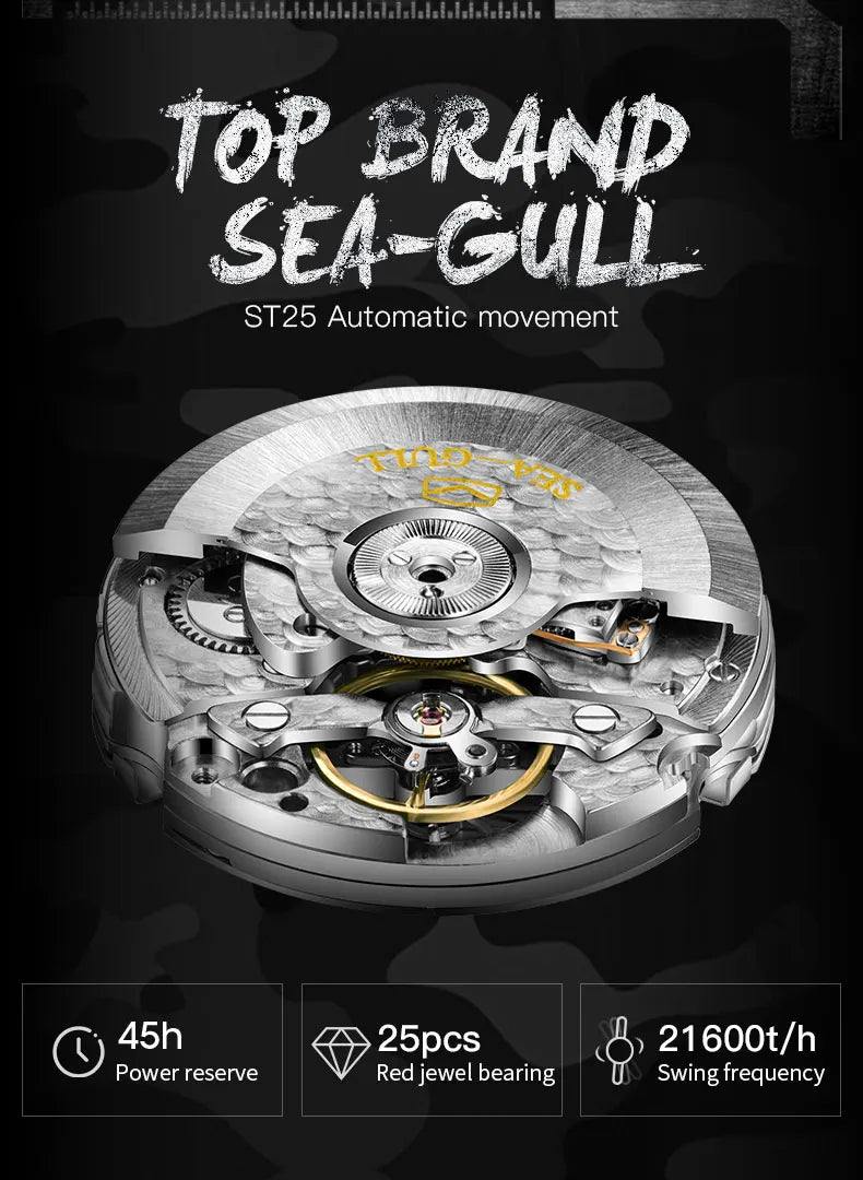 - Movement: Sea-Gull ST2500 automatic, 25 jewels, 21,600 vibrations/hour