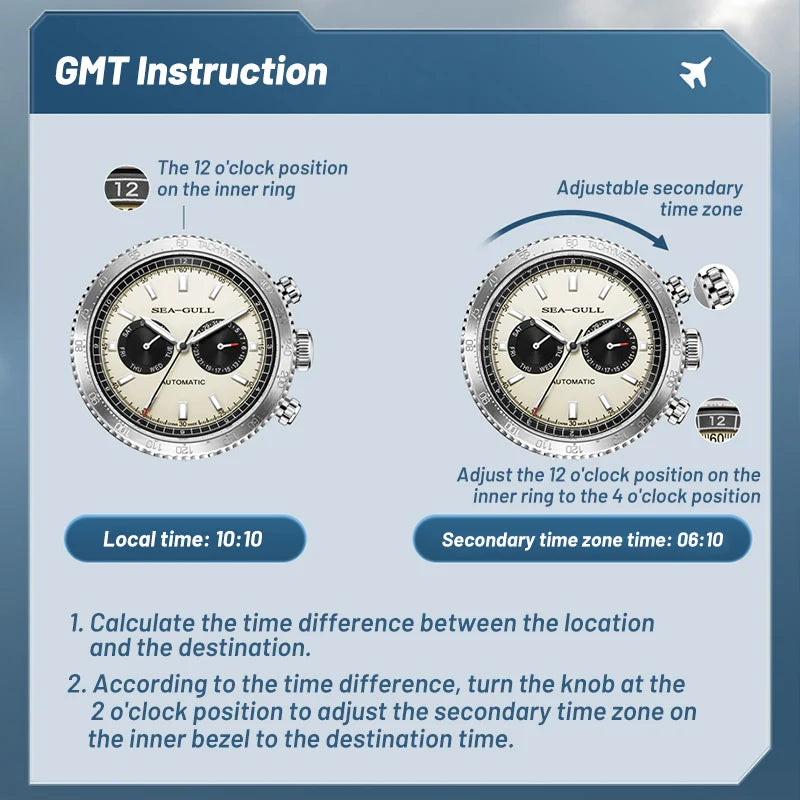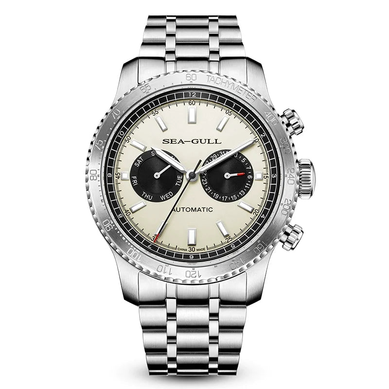 The Sea-Gull 6177 is a tribute to aviation heritage with its pilot chronograph-inspired Panda dial, while offering practical complications such as GMT and dual calendar. Whether on the ground or in the air, it delivers precision, clarity, and timeless style.
